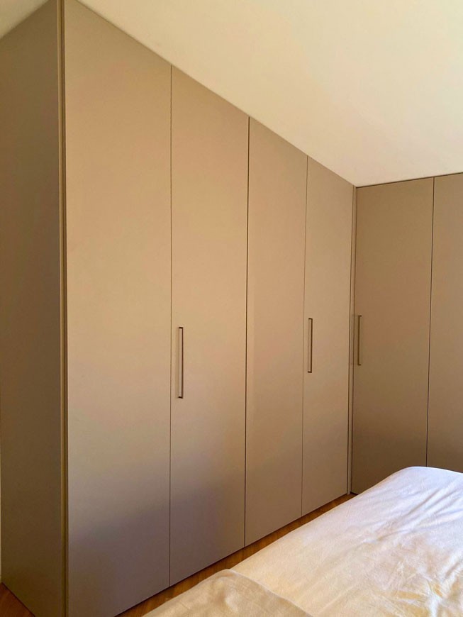 Il taglio “in randa” delle ante si adatta perfettamente alla mansarda, creando un fronte pulito e continuo, quasi architettonico. La scelta della finitura in laminato color sabbia scalda l’ambiente con una tonalità neutra ed elegante, facile da abbinare a parquet e tessili.