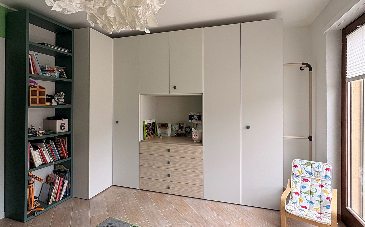 Questa cameretta è stata progettata per accompagnare un bambino di 8 anni nel tempo, con soluzioni capaci di rispondere alle esigenze di oggi e a quelle dei prossimi anni. Il cuore del progetto è un armadio ampio e ben organizzato, studiato per offrire grande capienza e completato da una zona appenderia a vista, pratica e immediata, ideale per favorire autonomia e ordine nella quotidianità.